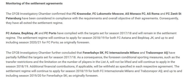 Non è ancora finita invece per l’Inter non ha soddisfatto completamente le richieste e dunque resterà sotto "settlement" anche per la prossima stagione di coppe: con restrizioni sportive e finanziarie. Di fatto la dirigenza dovrà valutare le spese fatte per il mercato negli ultimi due anni (da quando non è in Europa) e le entrate: dovranno essere in parità. E quindi dovrà pareggiare i conti. Se vuole fare mercato deve vendere".