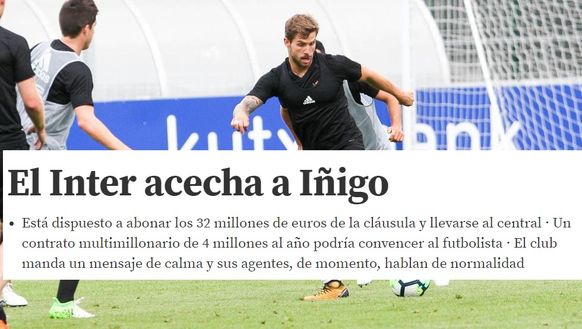 "Nel giro di un paio di giorni, la Real Sociedad potrebbe perdere due difensori che la scorsa stagione erano titolari. Dopo Yuri Berchiche al Paris Saint Germain, anche Iñigo Martínez, uno dei pilastri della squadra, potrebbe lasciare la Spagna. La minaccia principale è l'Inter, con i nerazzurri che sono disposti a pagare i 32 milioni di euro della clausola per rafforzare il reparto difensivo. Nell'aprile scorso Inigo ha rinnovato il suo contratto fino al 2021 ma l'offerta dei nerazzurri può convincere a lasciare la Real Sociedad. L'Inter ha messo sul piatto un contratto da 4 milioni di euro a stagione e il giocatore ha avvisato la dirigenza del club spagnolo che potrebbe partire per giocare nel campionato italiano.