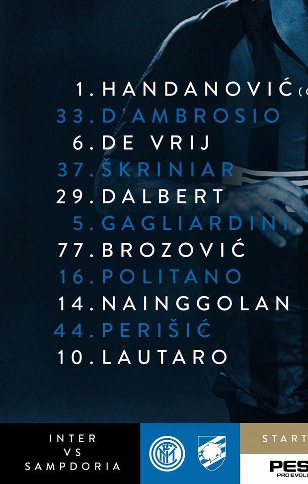 Dopo giorni tumultuosi e pieni di polemiche, l'Inter torna finalmente in campo in campionato in una partita delicata come quella contro la Sampdoria. A San Siro, Luciano Spalletti opta per qualche cambio di formazione rispetto all'ultima uscita di Europa League contro il Rapid Vienna. In particolare, a centrocampo, dove al fianco di Brozovic giocherà Roberto Gagliardini, e sulla fascia sinistra, dove ci sarà Dalbert al posto di Asamoah. In avanti, Politano, Nainggolan e Perisic dietro Lautaro Martinez.