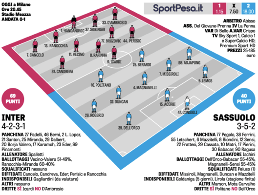 Inter (4-2-3-1): Handanovic; Cancelo, Skriniar, Miranda, D'Ambrosio; Brozovic, Vecino; Candreva, Rafinha, Perisic; Icardi