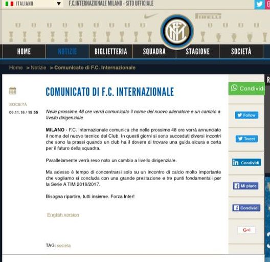 ORE 15:56 - MILANO - F.C. Internazionale comunica che nelle prossime 48 ore verrà annunciato il nome del nuovo tecnico del Club. In questi giorni si sono succeduti diversi incontri che sono la prassi quando un club ha il dovere di trovare una guida sicura e certa per il futuro della squadra.