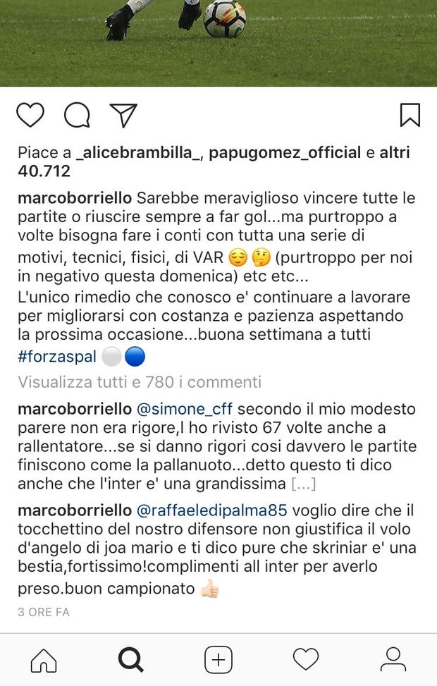 Marco Borriello, su Instagram, è tornato su Inter-Spal, contestando la decisione dell'arbitro di concedere il rigore all'Inter dopo aver consultato il Var