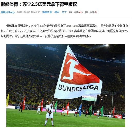 Suning, azienda proprietaria dell'Inter, continua la sua crescita e la sua espansione. Secondo quanto riferito dalla stampa cinese, dal sito Sohu in particolare, Suning ha acquistato i diritti tv della Bundesliga per la Cina per il quinquennio 2018-2023 per un valore di 250 milioni di dollari, circa 235 milioni di euro. Suning, quindi, è ora ufficialmente media partner della Bundesliga, l'ultimo campionato finito nel mirino del colosso cinese, che già ha acquistato i diritti per Premer e Liga.