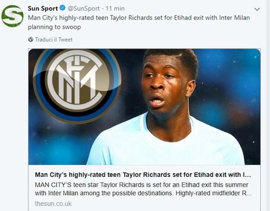 Non solo Agoumé: l'Inter è attentissima al mercato dei giovani talenti in giro per l'Europa. Come vi abbiamo riportato, è da poco terminato l'incontro con l'entourage del centrocampista del Sochaux, che ha molte offerte ma che sembra vicino allo sbarco in nerazzurro. Come detto, però, l'Inter vara anche altre pista e una di queste, secondo quanto riportato in Inghilterra dal Sun, porta dritta a Taylor Richards, centrocampista nato il 4 dicembre del 2000 delle giovanili del Manchester City, arrivato dal Fulham nel 2017.