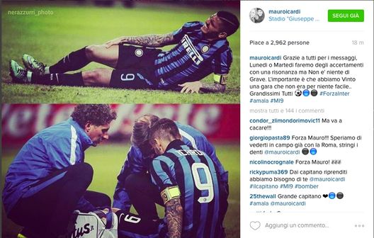Mauro Icardi ha abbandonato anzitempo il terreno di gioco nella gara contro il Bologna. L'attaccante nerazzurro, attraverso il proprio profilo Instagram ha voluto ringraziare i tifosi nerazzurri che si sono preoccupati per le sue condizioni. Il capitano nerazzurro