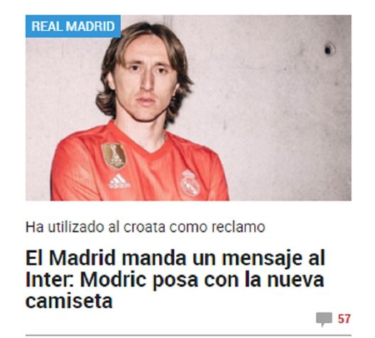 "Il Madrid manda un messaggio all'Inter: Modric posa con la nuova maglia". Marca interpreta come un segnale di mercato ai nerazzurri la scelta del Real Madrid di usare anche la foto di Modric per la presentazione della nuova terza maglia. Ovviamente, la foto risale a prima del Mondiale ma, segnala il quotidiano spagnolo, "Cristiano Ronaldo non è mai stato fatto posare con le nuove divise". Un segnale della volontà di cedere il portoghese e di non cedere il croato.