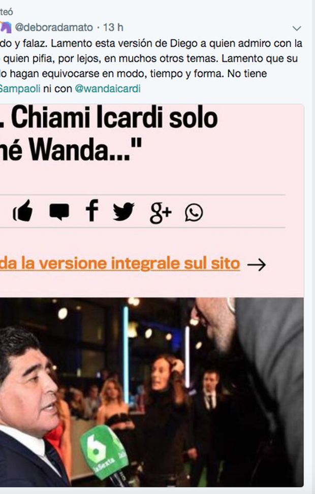 Poche ore prima del sorteggio, ancora una volta Diego Maradona ha attaccato il c.t. dell'ArgentinaJorge Sampaoli perché "la Nazionale deve migliorare, non può giocare così male come sta facendo". Su Twitter la giornalista Débora D'Amato ha criticato le parole del Pibe de Oro riportando alcune dichiarazioni di Maradona rilasciate tempo fa che attaccavano Icardi e Wanda Nara. Così la moglie e agente del capitano nerazzurro ha pubblicato due tweet: "Raccomando l'antidoping che in eventi così importanti ci sono sempre persone annebbiate che cercano solo di rovinarli con invenzioni e affermazioni fuori luogo". Poi in un altro ha aggiunto: "È un'ossessione" . Che il bersaglio fosse proprio Maradona?