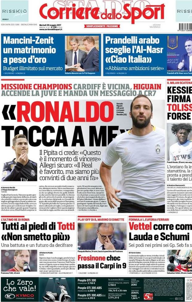 La prima pagina del Corriere dello Sport parla del futuro di Roberto Mancini: per l'ex tecnico dell'Inter c'è lo Zenit, pronto a concedere un budget illimitato sul mercato per convincerlo. Intervista a Higuain, che sfida Cristiano Ronaldo e il Real Madrid, mentre Kessie va al Milan.