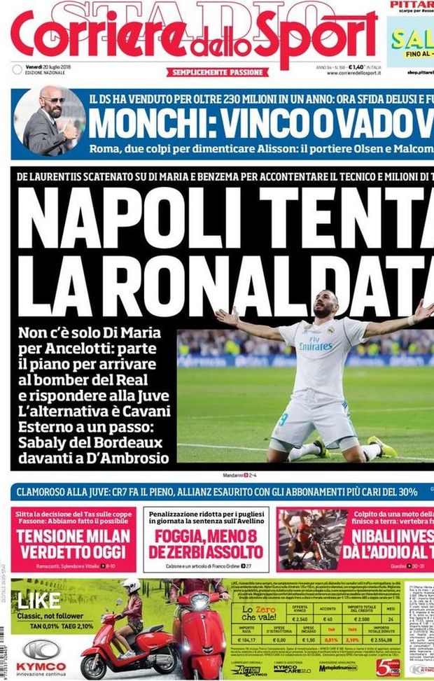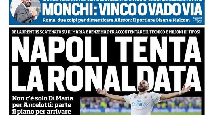"Il portiere Olsen e Malcom. Roma, due colpi per dimenticare Alisson. Monchi: 'Vinco o vado via'. Il ds ha venduto per oltre 230 mln in un anno: ora sfida delusi e futuro". Il Corriere dello Sport nel taglio alto parla del mercato della Roma e pare proprio che il giocatore brasiliano che piace all'Inter si stia avvicinando al club della capitale. Il titolo principale è per il Napoli che "tenta la ronaldata". "Non c'è solo Di Maria per Ancelotti: parte il piano per arrivare al bomber del Real". Oggi il verdetto per il Milan dal Tas di Losanna che si deve esprimere sul ricorso per la mancata ammissione all'Europa League.