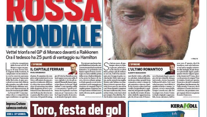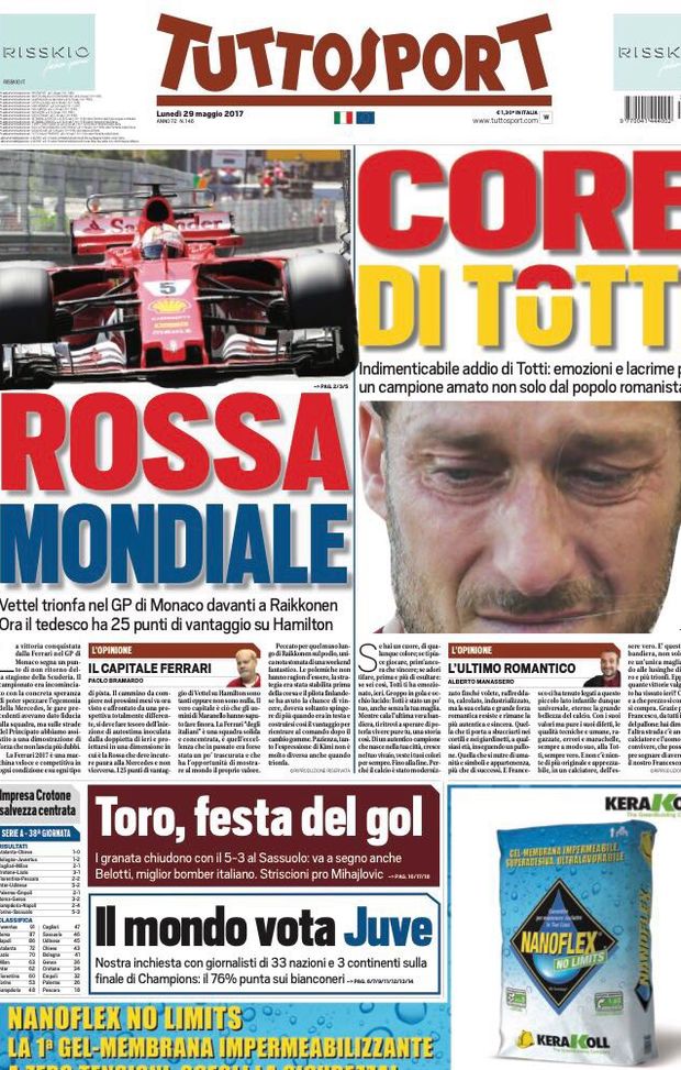 Tuttosport dedica ampio spazio in prima pagina all'addio di Francesco Totti (definito l'ultimo romantico) alla Roma: "Core di Totti. Indimenticabile addio di Totti: emozioni e lacrime per un campione amato non solo dal popolo romanista". E poi sul Torino: "Toro festa del go. I granata chiudono con il 5-3 al Sassuolo: va a segno anche Belotti, miglior bomber italiano. Striscioni pro Mihajlovic".