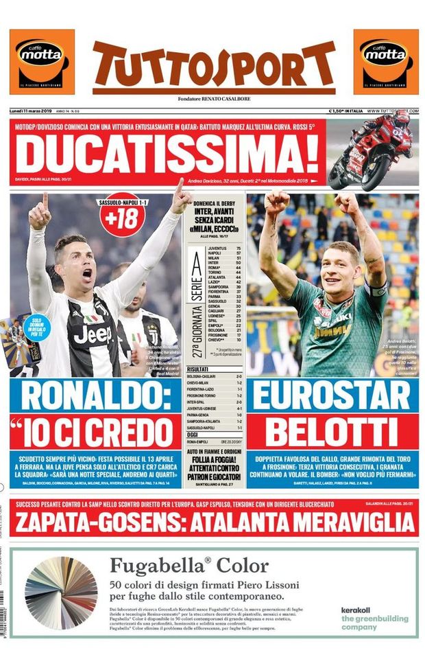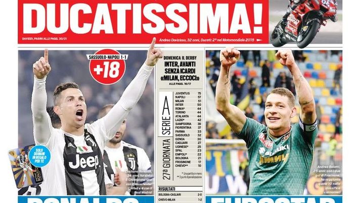 Sulla prima pagina di Tuttosport si parla della vittoria dell'Inter sulla Spal
