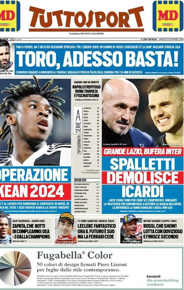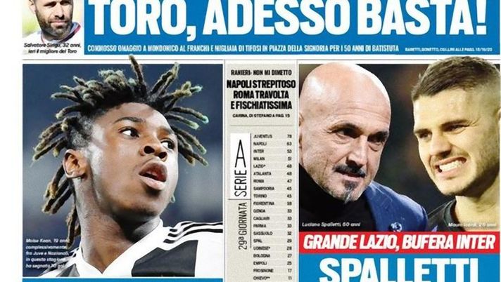 "Spalletti demolisce Icardi: grande Lazio, bufera Inter. 'Deve stare fuori per come si è comportato. Umiliante la trattativa per convincerlo a mettersi la maglia dell'Inter. La differenza la fanno Ronaldo e Messi, non lui'". Così, nella prima pagina in edicola nelle prossime ore, Tuttosport titola sull'Inter e sul caso Icardi, riesploso in casa nerazzurra.