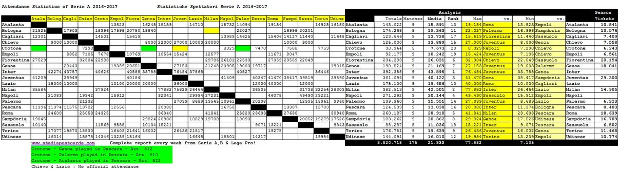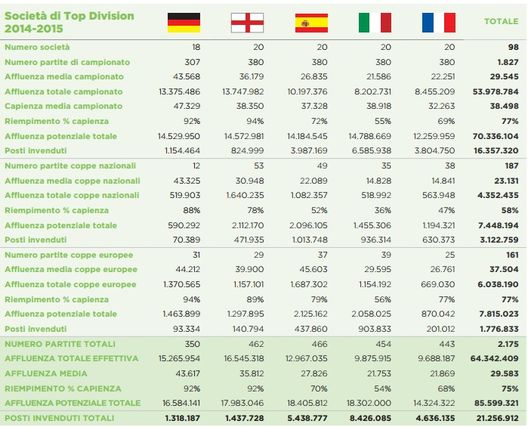 L'annuale Report calcio della Figc sottolinea ancora una volta come in questo 2016, la Serie A stenti a decollare. Infatti la media di 22.000 spettatori a partita (21.586) è molto lontana dalla media degli altri campionati europei. La Bundesliga è il campionato con la media spettatori più alto d'Europa, 43.568 nella stagione 2014/15, la Premier 36.179, la Liga 26.835 e la Ligue1 22.251. Se si va a guardare la media spettatori dei campionati extraeuropei, anche il Messico (25.557) e l'India (25.371) fanno meglio della Serie A, in ascesa la media dei campionati americano (19.148) e cinese (18.756).