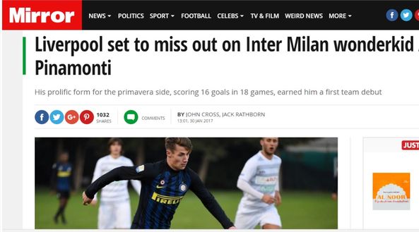 Andrea Pinamonti sta incominciando a riscuotere un discreto successo anche all'estero ed è già un nome caldo nelle indiscrezioni di mercato legate ai grandi club europei. Il Mirror segnala a questo proposito di un interesse da parte del Liverpool di Klopp, che avrebbe tentato di accaparrarsi (senza successo) il baby bomber nerazzurro nella finestra di mercato di gennaio. Il Liverpool (e anche la Juventus) ci avrebbero provato quando i discorsi sul contratto di Pinamonti sembravano ad un punto morto - scrive sempre il Mirror - mentre adesso ci si aspetta che l'attaccante resti all'Inter. L'esito dei discorsi relativi al suo contratto non è infatti mai stato in discussione, Ad attirare le attenzioni dei grandi club i 16 gol segnati in 18 partite nel campionato Primavera. Numeri che non erano passati sotto traccia nemmeno in casa Inter: ora Pinamonti è infatti alla corte di Stefano Pioli in prima squadra e ha già esordito in una partita di Europa League. Scrive di lui il Mirror: "Pinamonti si muove come il Fernando Torres che giocava ad Anfield, mentre la sua tecnica nel tirare i rigori assomiglia a quella di Neymar". Ma l'Inter non ha nessuna intenzione di cedere i suoi giovani, men che meno un giovane così talentuoso come Andrea Pinamonti. E l'indiscrezione inglese relativa ad un tentativo da parte di Klopp di strappare il giovane bomber all'Inter non trova nessun fondamento: da quello che ci risulta si tratta solamente di speculazioni giornalistiche. Il Liverpool, in ogni caso, non può pensare che un errore come quello commesso con Coutinho dai nerazzurri (e ammesso proprio ieri dal ds Ausilio) verrà ripetuto: con l'avvento del gruppo Suning i tempi sono decisamente cambiati. I giovani non si toccano.