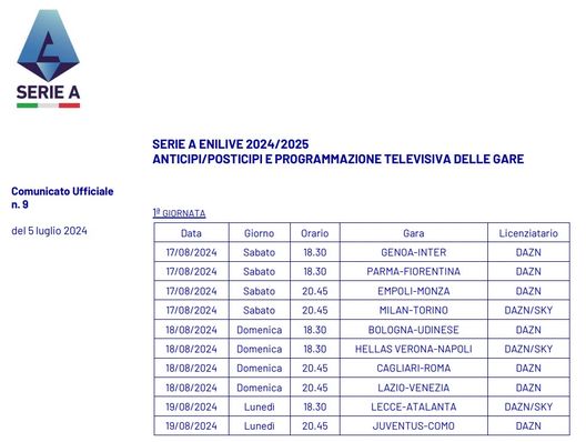 Fatto il calendario, arrivano i primi aggiornamenti su anticipi e posticipi del prossimo campionato di Lega Serie A. Sono state pubblicate le date e gli orari, con i rispettivi canali tv, delle prime tre giornate della prossima stagione. Si parte il 17 agosto con l'Inter impegnata il sabato sera alle 18.30 contro il Genoa a Marassi. E la diretta della partita sarà trasmessa su DAZN.