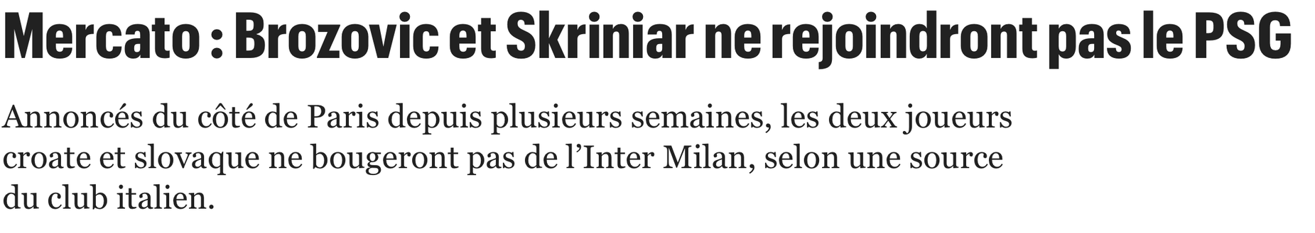 Il Paris Saint-Germain non acquisterà dall'Inter. E' sicuro in quest'affermazione il quotidiano francese Le Parisien, che afferma come, a meno di ribaltoni, sia impossibile che Marcelo Brozovic e Milan Skriniar firmino per il club parigino.