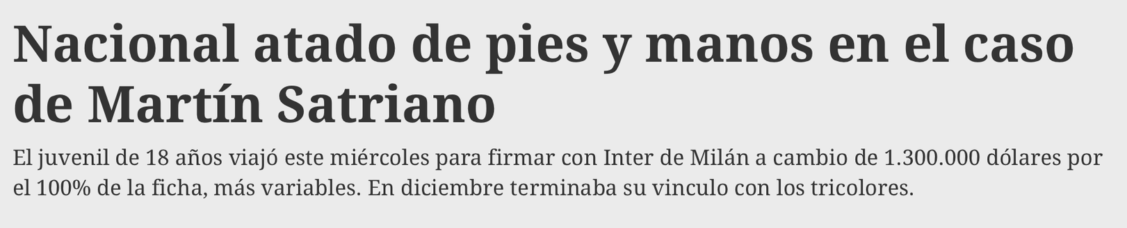 E' ormai in dirittura d'arrivo la trattativa tra l'Inter e il Nacional per il giovanissimo attaccante Martin Satriano. Come riporta il portale uruguaiano Ovacion, infatti, il club sudamericano ha annunciato che "il giocatore ha viaggiato in Italia da dove è arrivata un'offerta per il suo cartellino. Ha viaggiato con piena approvazione da parte dello staff tecnico e dell'area sportiva. Il National continua la trattativa senza fretta aspettando un accordo che soddisfi le aspirazioni di tutte le parti". Per il 2001 il Nacional chiede circa 1.4 milioni di euro, con bonus variabili e raggiungibili con varie presenze del calciatore in nerazzurro.