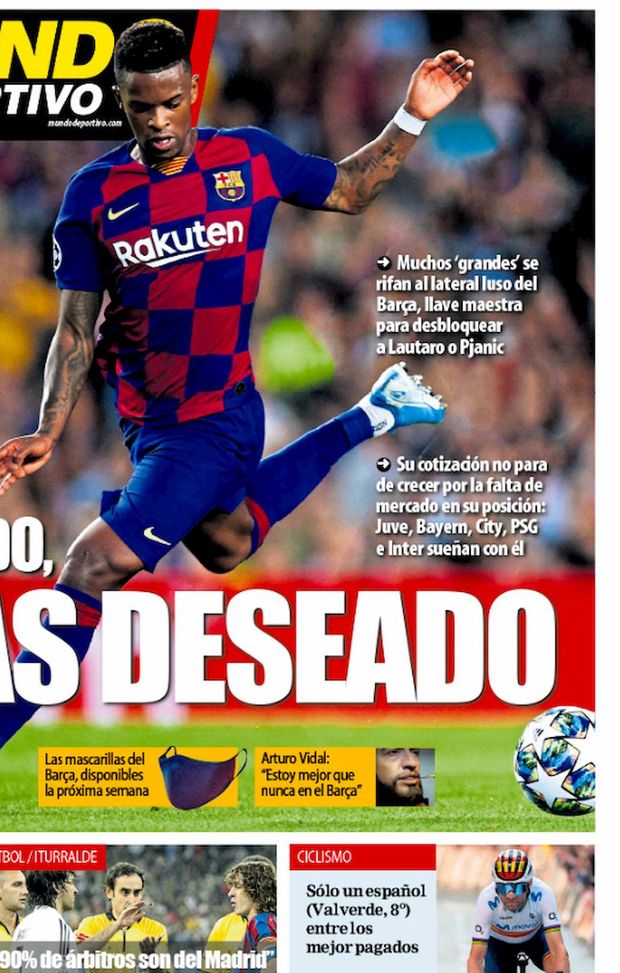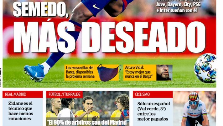 Fra i nomi fatti con maggiore insistenza c'è quello di Semedo. Ed è proprio sul laterale portoghese che si incentrano i titoli di MD: "Semedo, il più desiderato. Molte grandi sono sulle tracce del laterale portoghese del Barça, chiave principale per sbloccare le trattative Lautaro e Pjanic. La sua quotazione non smette di crescere per la mancanza di alternative nella sua posizione: Juventus, PSG, Manchester City, Bayern Monaco e Inter lo sognano".