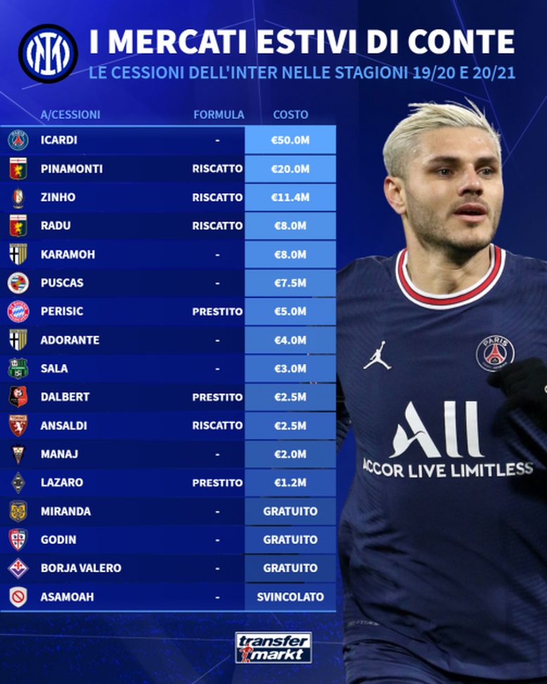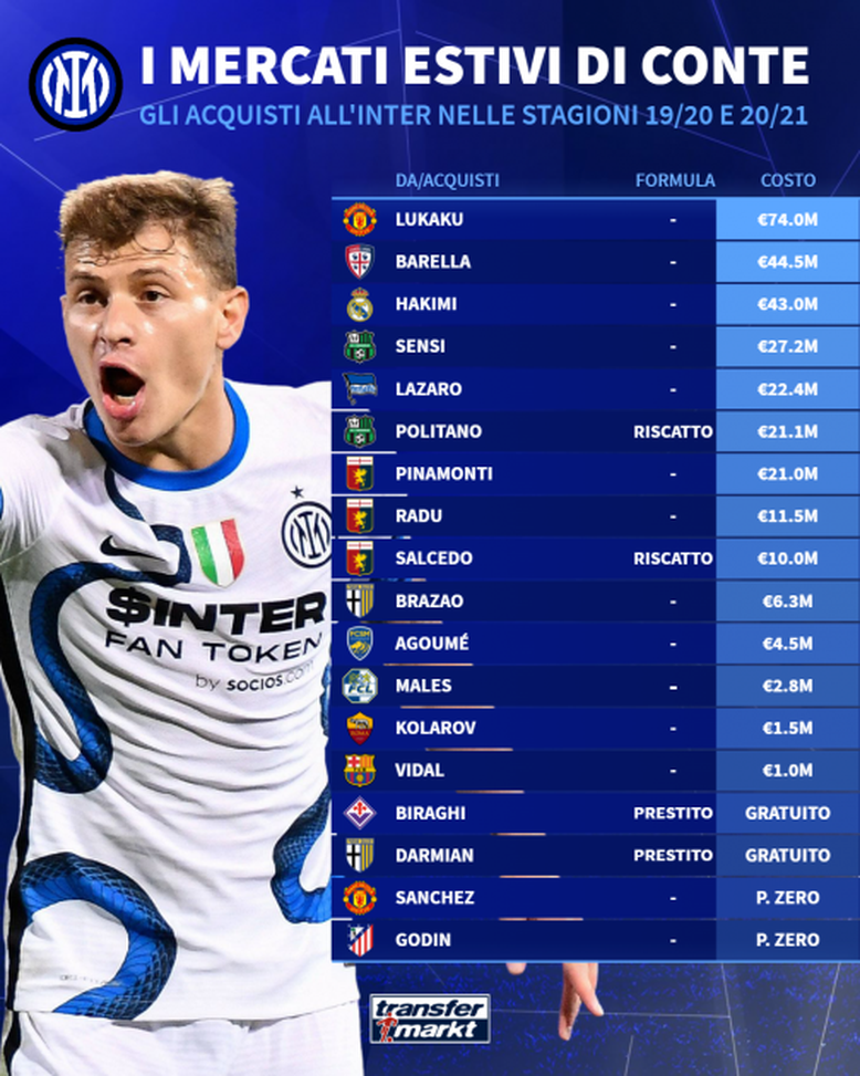 "L'altro allenatore fu l'acerrimo rivale Antonio Conte, che rivoluzionò la squadra portandola alla difesa a tre con l'aggiunta di Diego Godín, lanciando dal Cagliari Nicolò Barella (affare da 44,5 Mio. € complessivi tra prestito e riscatto), puntando su Lautaro in attacco e affidando il ruolo di boa all'acquisto più costoso della storia della Beneamata, Romelu Lukaku (74 Mio. €)".