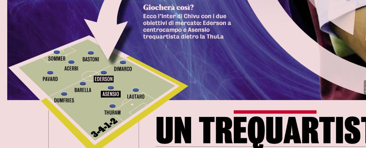 La Gazzetta dello Sport si sbilancia e disegna la nuova Inter, con un 3-4-1-2 molto offensivo, con Marco Asensio alle spalle di Lautaro e Thuram