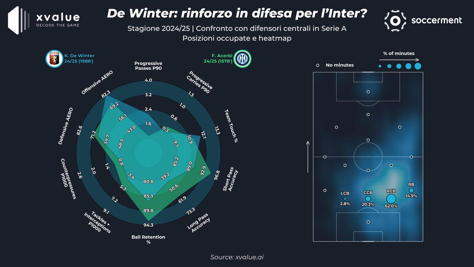 Acerbi, e non solo per una mera questione anagrafica, risulta essere un giocatore più vecchio stampo: De Winter preferisce impostare, lo si vede dal dato delle percentuali dei passaggi per le squadre e soprattutto per i passaggi progressivi nei 90’. Il genoano, di fatto, sale di più palla al piede, e potrebbe essere un’arma a disposizione per la manovra di Inzaghi.