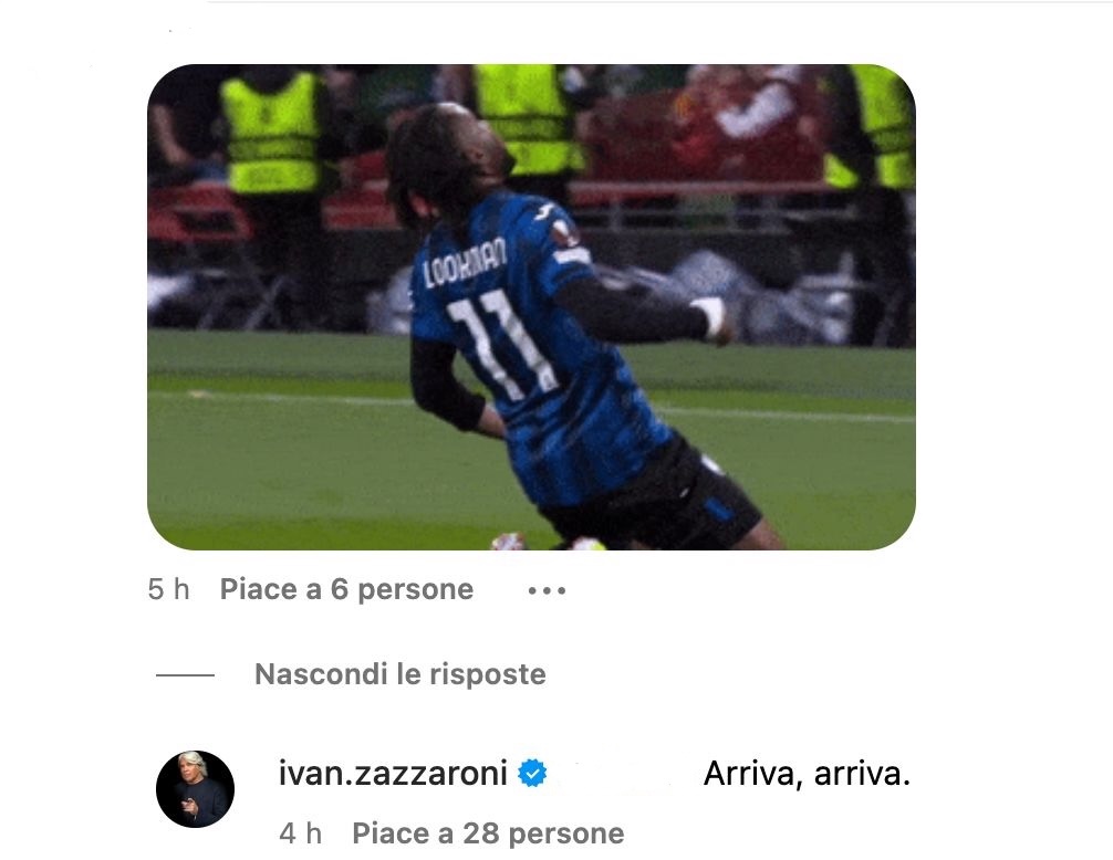 Il direttore del quotidiano, poi, ha voluto far sognare ulteriormente i supporter dell'Inter. Sotto un commento di un utente che ha postato l'esultanza del numero 11 dell'Atalanta, Zazzaroni ha scatenato l'entusiasmo con un commento molto chiaro: "Arriva, arriva", ha scritto.