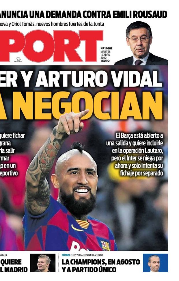 La prima pagina di Sport in edicola martedì 14 aprile 2020 lancia in copertina l'affare Inter-Vidal: "Il club italiano vuole acquistare il giocatore blaugrana e il cileno potrebbe andare via perché vuole firmare un contratto lungo per una squadra con un grande progetto sportivo", scrive il quotidiano catalano che poi riporta anche la posizione del Barcellona: "Il Barça apre alla cessione e vorrebbe includerlo nell'affare Lautaroperò l'Inter per ora rifiuta e vuole trattare per Vidal come affare separato".