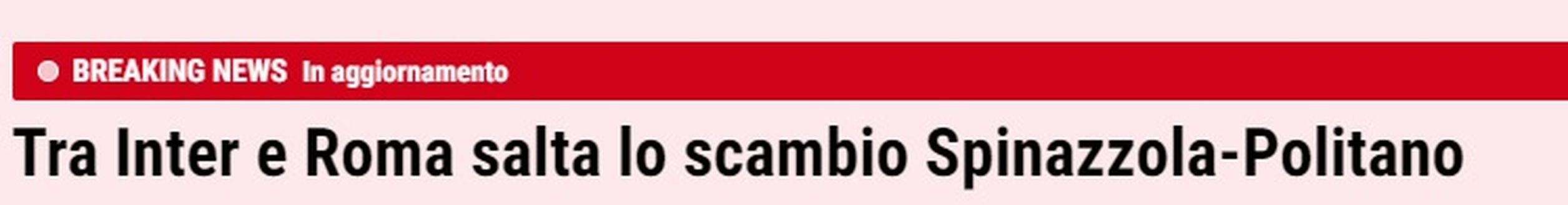 "Ennesimo colpo di scena nella trattativa per Roma e Inter. Ieri pomeriggio le due società avevano trovato una base di accordo sullo scambio che avrebbe portato Leonardo Spinazzola in nerazzurro e Matteo Politano in giallorosso e c'erano soltanto alcuni dettagli da sistemare sulla formula e le condizioni della trattativa.