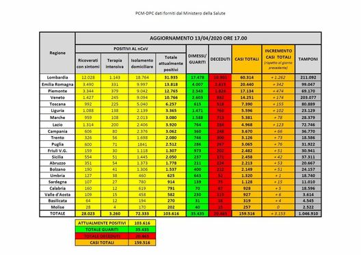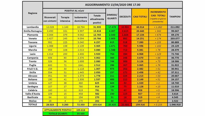 Attualmente i soggetti positivi sono 103.616, +1.363 rispetto a ieri (+ 1,3%) e il conto sale a 159.516 aggiungendo ai casi attualmente attivi anche morti e guariti.