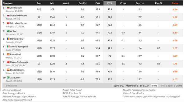 Primo tra i centrocampisti per numero medio di passaggi a partita: