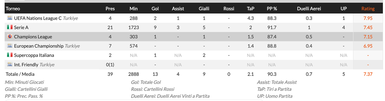 Il dato sui passaggi chiave dimostra come il turco non ha perso il feeling per mandare i compagni in porta:
