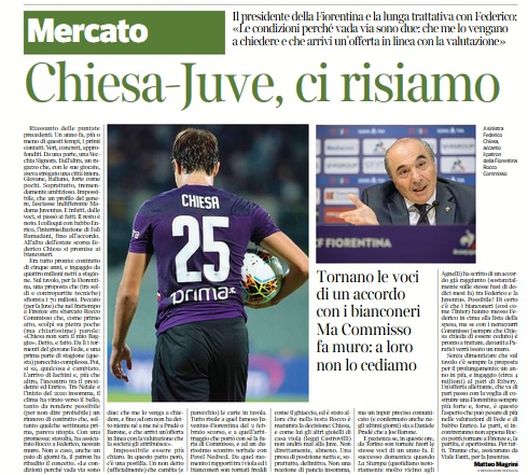 "Di certo c’è che i bianconeri (così come l’Inter) hanno messo Federico in cima alla lista della spesa, ma se con i nerazzurri Commisso (sempre che Chiesa chieda di essere ceduto) è pronto a trattare, davanti a Paratici verrà issato un muro", sottolinea il quotidiano.