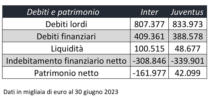 Per quanto riguarda il patrimonio netto, per la Juventus era pari a 42 milioni ma, complice le perdite per 75 milioni al 30 settembre 2023, è stato annunciato nei giorni scorsi un nuovo aumento di capitale da 200 milioni per riequilibrare la situazione.