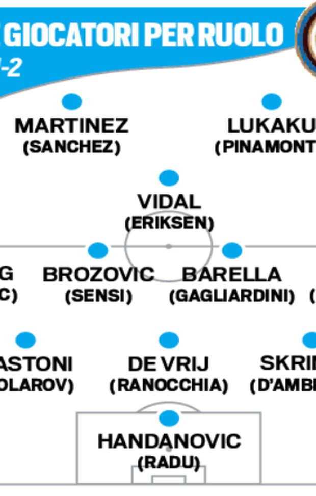 "Nainggolan dovrebbe essere incluso in lista Uefa dove esclusi sarebbero il terzo portiere Padelli (negli slot riservati agli under c’è comunque Filip Stankovic, numero 1 della Primavera) e Matias Vecino che rientrerà soltanto a novembre e salterà le prime tre gare del girone. Tra l’altro, l’opera di snellimento che ha riguardato la rosa nell’ultimo giorno di mercato, ha consegnato a Conte una rosa di 25 elementi, con un paio di giocatori “multitasking”, su tutti Stefano Sensi e Matteo Darmian", aggiunge il quotidiano