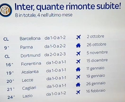 A Skysport sottolineano in particolare quella arrivata dopo il primo tempo niente male di Barcellona, in Champions League. A Dortmund era successa la stessa cosa. Gli uomini di Conte erano in vantaggio per due a zero e la partita è finita 3-2 per i tedeschi.