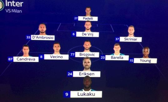 (3-5-1-1): Padelli, D'Ambrosio, de Vrij, Skriniar; Candreva, Vecino, Brozovic, Barella, Young; Eriksen; Lukaku.