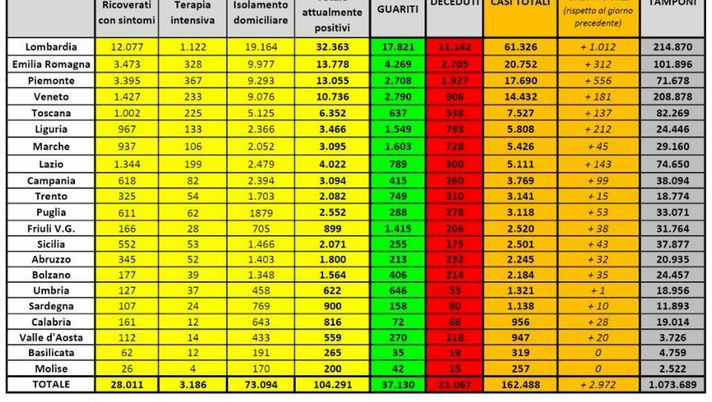 Attualmente i soggetti positivi sono 104.291, +675 rispetto a ieri (+ 0,7%) e il conto sale a 162.488 aggiungendo ai casi attualmente attivi anche morti e guariti.