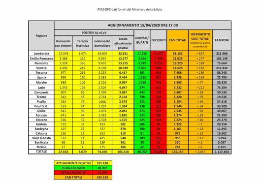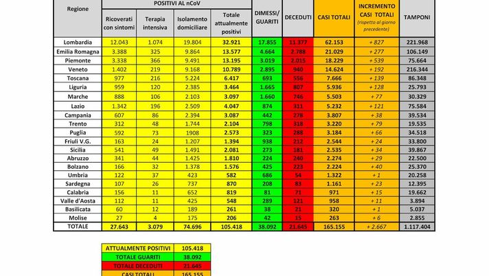 Attualmente i soggetti positivi sono 105.418, +1.127 rispetto a ieri (+ 1,1%) e il conto sale a 165.155 aggiungendo ai casi attualmente attivi anche morti e guariti.