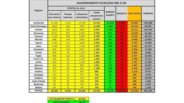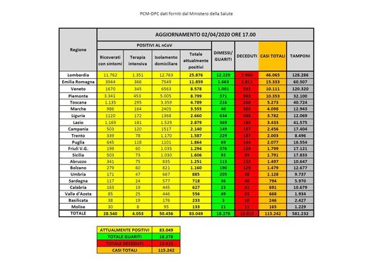 Attualmente i soggetti positivi sono 83.049 e il conto sale a 115.242 aggiungendo ai casi attualmente attivi anche morti e guariti.