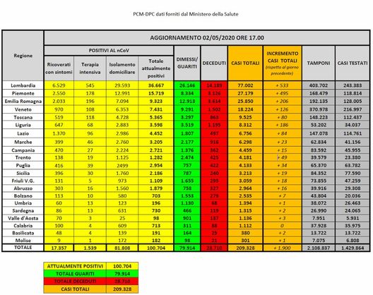 Attualmente i soggetti positivi sono 100.704, -239 rispetto a ieri e il conto sale a 209.328 aggiungendo ai casi attualmente attivi anche morti e guariti.