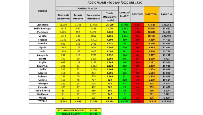 Attualmente i soggetti positivi sono 85.388, +2.339 rispetto a ieri (+2,8%) e il conto sale a 119.827 aggiungendo ai casi attualmente attivi anche morti e guariti.
