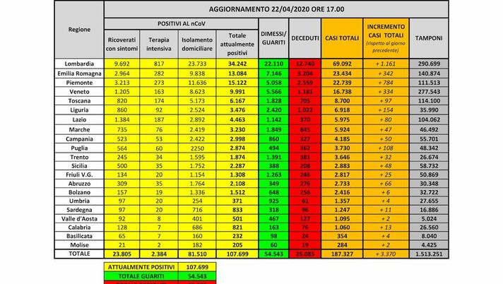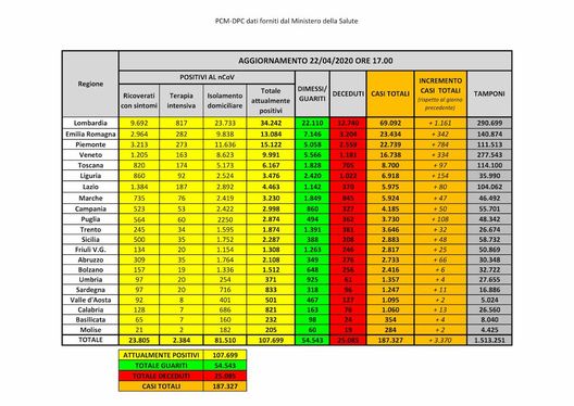 Coronavirus, bollettino 22 aprile: 437 morti, -10 casi attivi. Record di guariti: quasi 3000