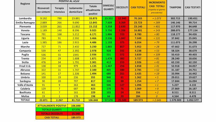 Attualmente i soggetti positivi sono 106.848, -851 rispetto a ieri (il decremento più importante finora) e il conto sale a 189.973 aggiungendo ai casi attualmente attivi anche morti e guariti.