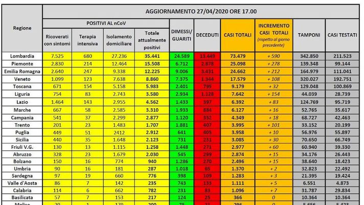 Coronavirus, bollettino 27 aprile: meno di 2000 contagi ma solo 32.000 tamponi. 333 i morti