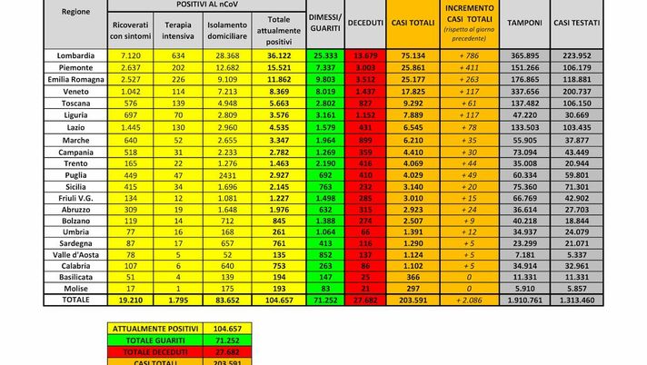Attualmente i soggetti positivi sono 104.657, -548 rispetto a ieri e il conto sale a 203.591 aggiungendo ai casi attualmente attivi anche morti e guariti.