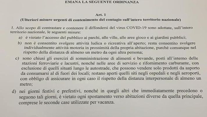 ALIMENTARI - "Sono chiusi gli esercizi di somministrazione di alimenti e bevande, posti all'interno delle stazioni ferroviarie e lacustri, nonché nelle aree di servizio e rifornimento carburante, con esclusione di quelli situati lungo le autostrade, che possono vendere solo prodotti da asporto da consumarsi al di fuori dei locali; restano aperti quelli siti negli ospedali e negli aeroporti, con obbligo di assicurare in ogni caso il rispetto della distanza interpersonale di almeno un metro".