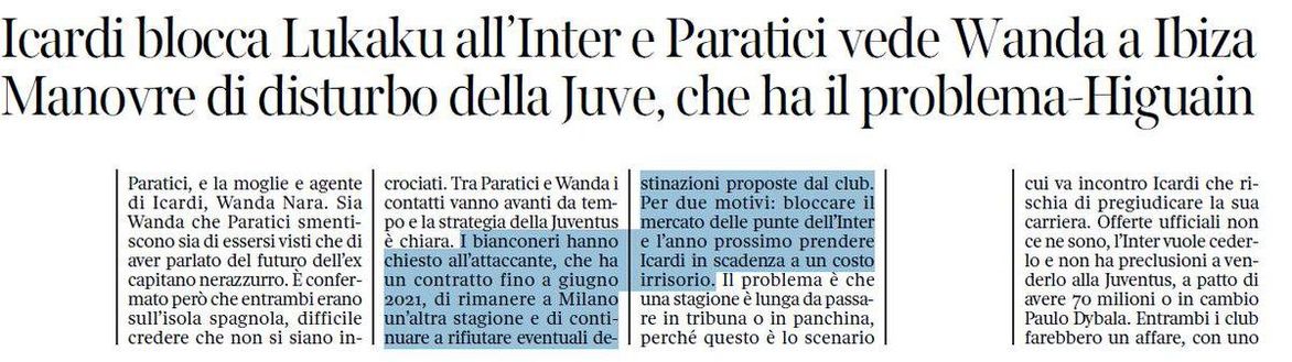 Il Corriere della Sera fa il punto della situazione, rivelando la strategia che la Juventus è pronta ad attuare per mettere le mani su Icardi e, parallelamente, mettere in difficoltà l'Inter: "Martedì sera a Ibiza si sarebbero incontrati il direttore sportivo della Juventus, Fabio Paratici, e la moglie e agente di Icardi, Wanda Nara.