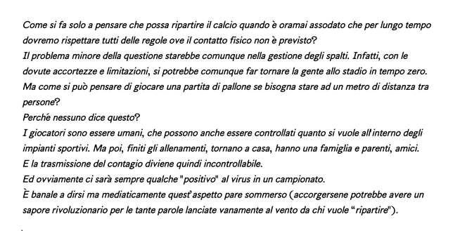 "Milano piange i suoi morti. La Lombardia e l’Italia intera sono in ginocchio e la vita di tutti noi è segnata da un presente devastante e da un futuro incerto. Abbiamo fino ad ora reputato che lo strumento più forte in nostro possesso fosse quello di esporci attraverso un impegno sociale- mai prima come adesso- necessario. Campionato sì, campionato no. Stadi pieni, stadi vuoti. Chissenefrega. Non può essere una diatriba e nemmeno un qualcosa su cui riflettere.