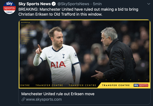 L'Inter può sorridere. Christian Eriksen ha ora una pretendente in meno. Secondo quanto riporta Sky Sports UK, infatti, il Manchester United non avrebbe presentato al Tottenham un'offerta per lui. Non solo, i Red Devils non avrebbero intenzione di fare alcun passo verso il danese, togliendosi dalla competizione.