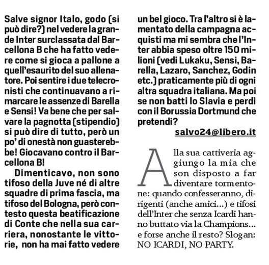 Vorrei tranquillizzare Cucci. Non credo che Conte e Marotta abbiano bisogno di gettarsi nelle mie braccia o in quelle di Pistocchi per consolarsi dell'Europa perduta. C'ero anche io fuori dai cancelli di Appiano Gentile per la conferenza stampa di Antonio Conte che non si è tenuta. Possiamo commentare la decisione dell'Inter (dell'Inter tutta, non di Conte o di un dirigente: dell'Inter intesa come società) di aver annullato all'ultimo momento la conferenza, ma non credo sia nemmeno più questo il punto della questione.